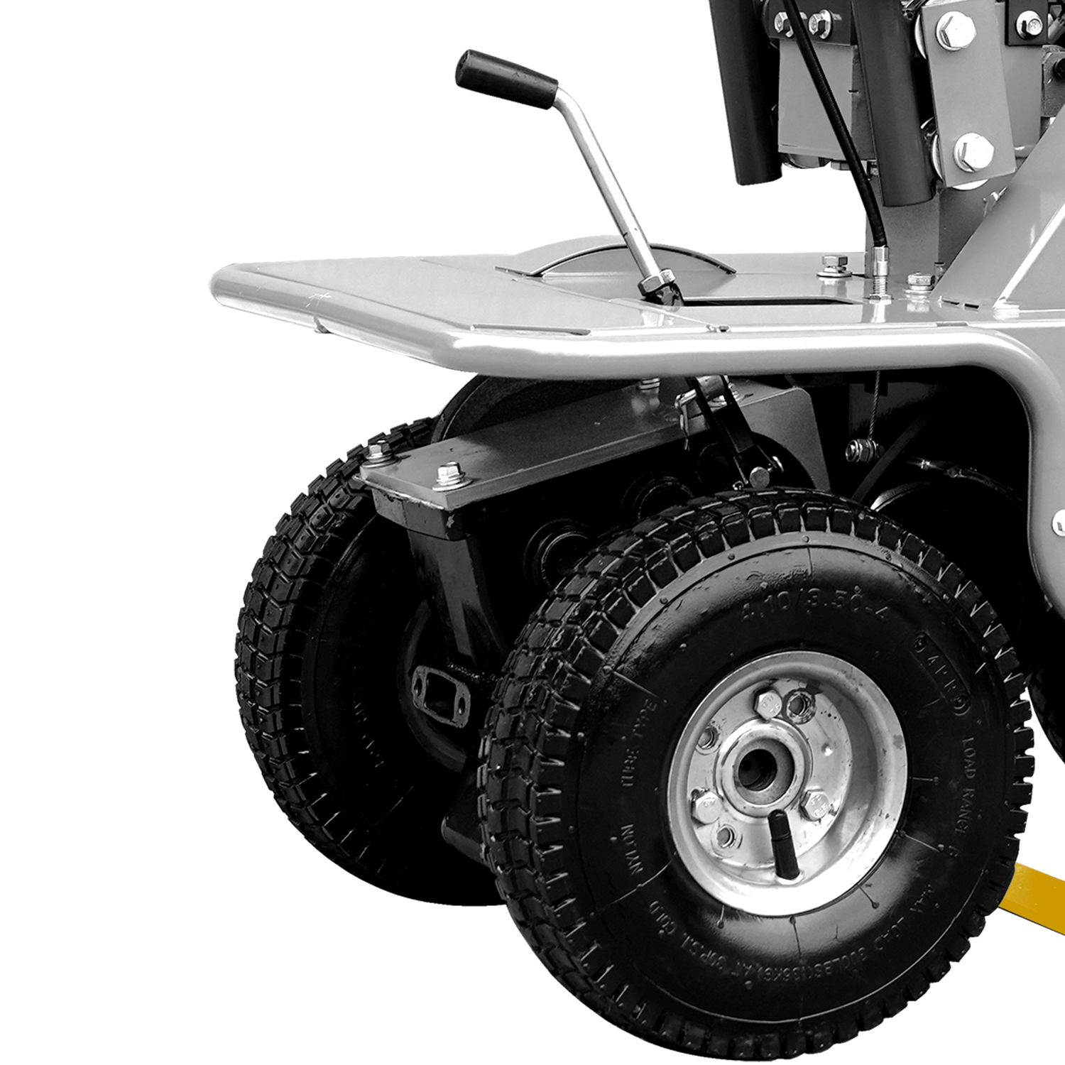 Um dem Bediener noch mehr Sicherheit zu geben, arbeitet der Antrieb der Messer nur in Schneidrichtung. Die Maschine ist mit breite Luftreifen ausgestattet um auch im nassen Gras eine hohe Traktion aufbauen zu können.